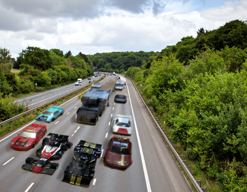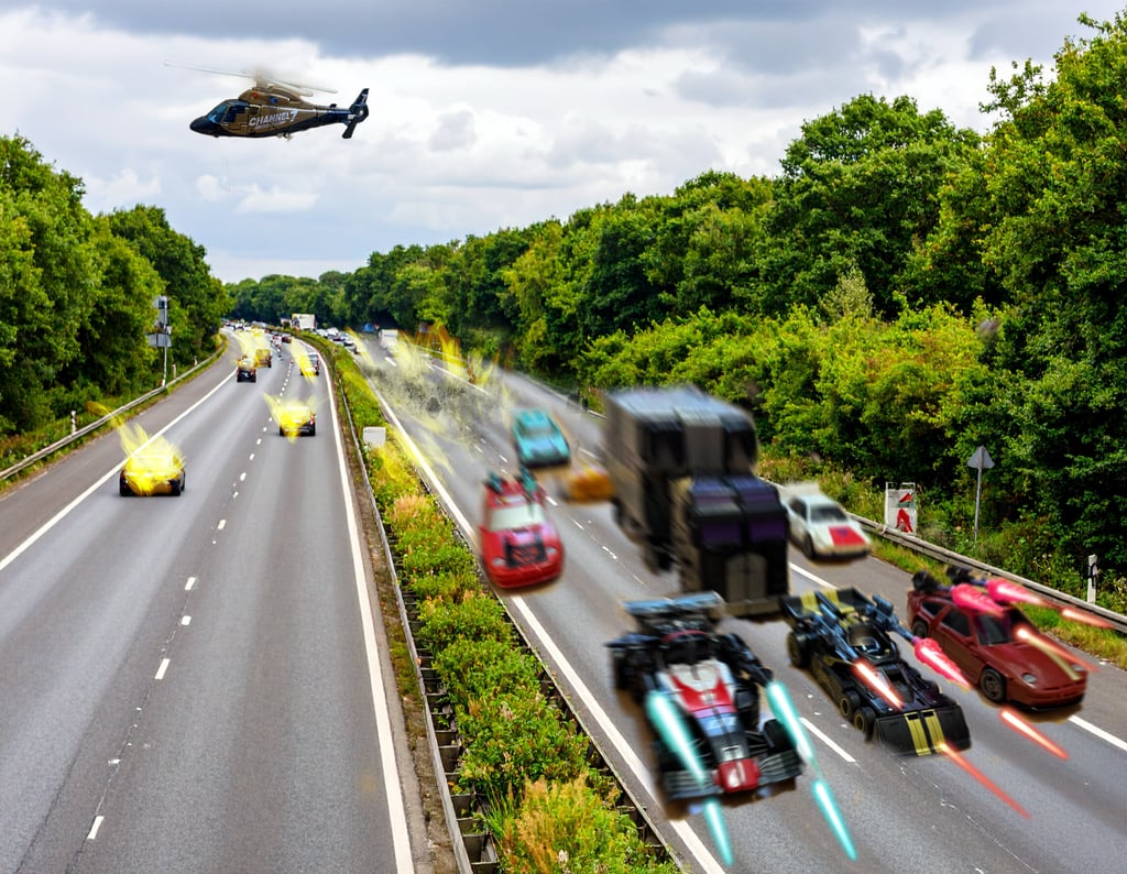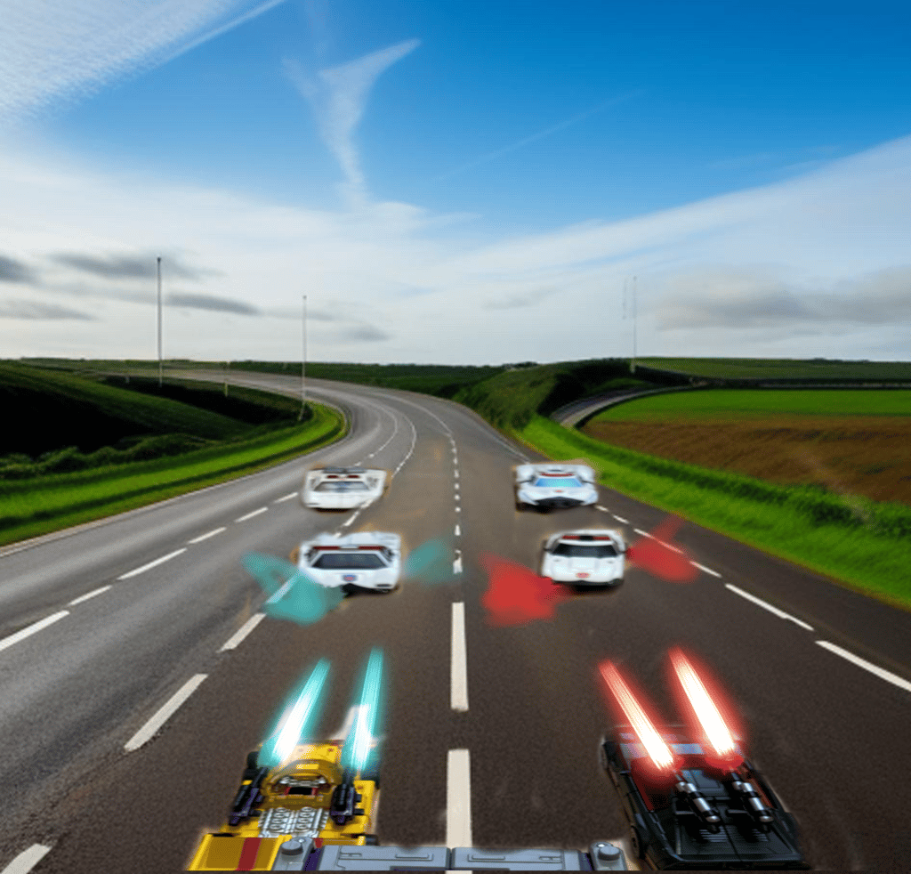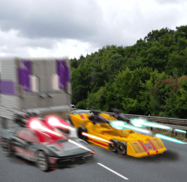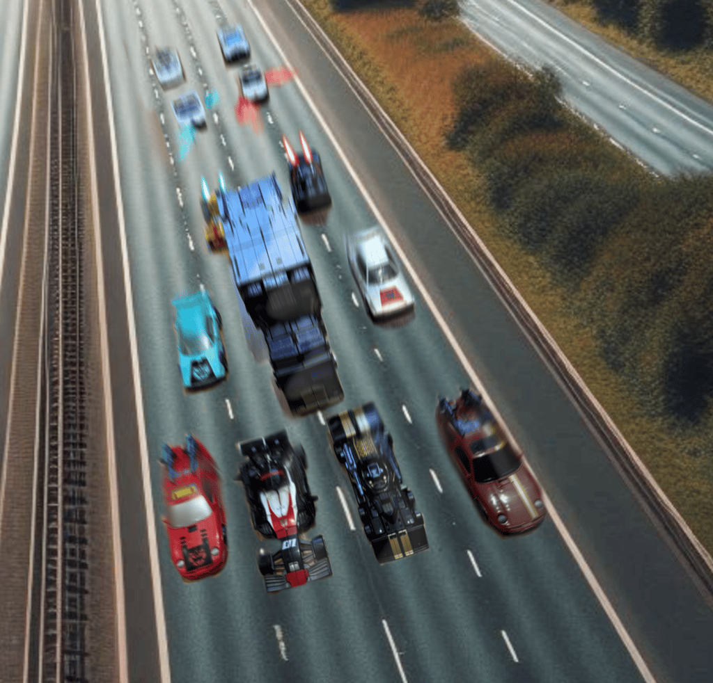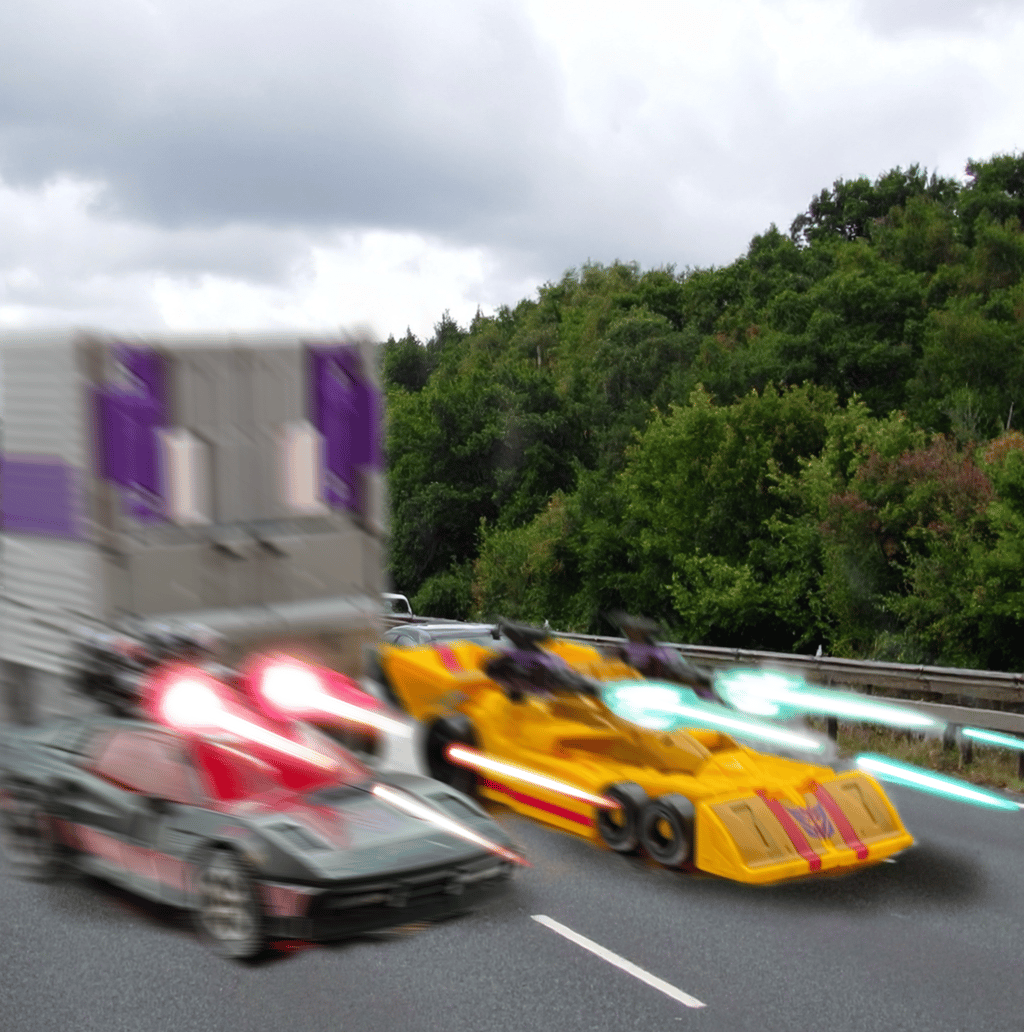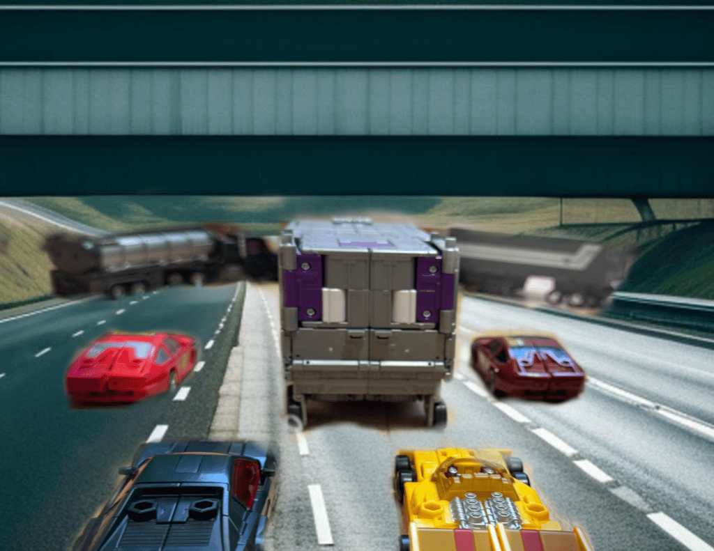 Traffic was heavy on the M60 motorway, the ring road around Manchester. Normally peaking at the morning and evening rush hours, it was late morning and yet there was still some residual traffic build-up from the earlier jams. On the connecting motorway from Bolton, the M61 that adjoined to St Peter’s Way, the group of ‘Stunticon’ vehicles headed out of town and towards the direction of the M60 and its queuing traffic. A strange sight, leading the group were the two Formula One type sports vehicles looking somewhat out of place on a British motorway. Straight behind them, the ‘film truck’ now revealed to be a vehicular menace in disguise, followed. Similarly, around the truck there was a group of fast cars of various styles and colours- one cyan, one white Lamborghini, one maroon Porsche with a gold stripe and one brighter coloured red Porsche, one black Ferrari and a yellow dragster. As the road widened to three lanes from the two of the A666, the six rear vehicles pulled alongside either side of the truck, making a formation that fully blocked the three lanes.