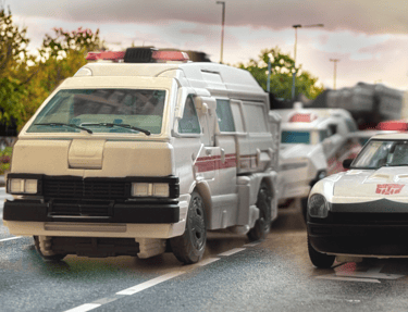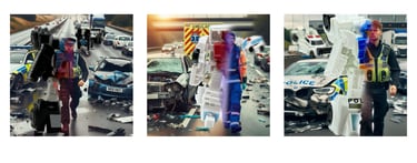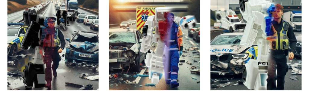 With those words, one ambulance and two police cars -one black, one white- suddenly leapt into the air and with a speed imperceptible to others watching, each landed on their robotic feet and quickly created an electronic wireframe mesh around themselves that rapidly solidified into a human form, each dressed per the service assistance as their prior vehicle mode. The three then ran to various humans and vehicles to see how they could assist.