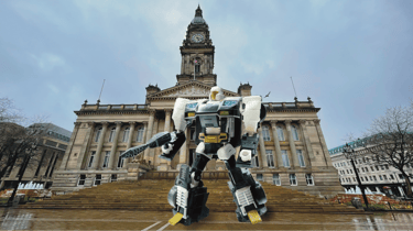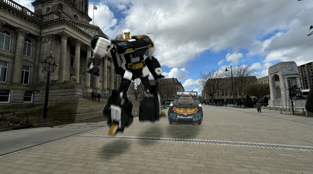 Behind the truck, the final group of cars, the Porsches and Lamborghinis began to move, knocking over humans and filming equipment as they did so. This all happened in mere seconds after the map had been received and the service vehicles were taken by surprise and struggled to respond. Ricochet was in the best position and carefully passing through the injured humans on the street and trying to avoid further damaging filming equipment, he headed in the same direction as the other cars and the truck. On Victoria Square he halted and parts of his vehicular form started to move and dislocate. Within seconds, what once had been a car, altered its form with complex mechanical changes until it stood a robotic bipedal form, standing tall in front of the town hall steps. In his hand, a weapon of some form that Ricochet raised and took aim with at the distant vehicles.