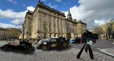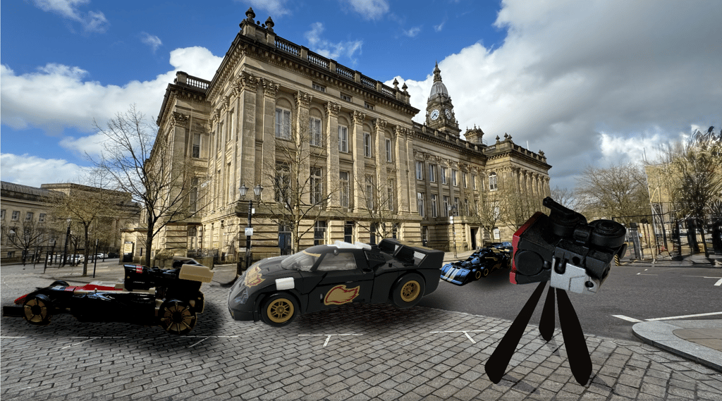“I’m trying to film a comedy about doing the Le Mans 24 hour race on a loop around Bolton and you bring me just one car?” Bolton was known for having its twin city of Le Mans in France, a city famous for its 24 hour road race around its streets. Taking place in the middle of June, the race had strict and definitive styles of cars that could compete. The black car with the flames being of that style, the two others distinctly not.