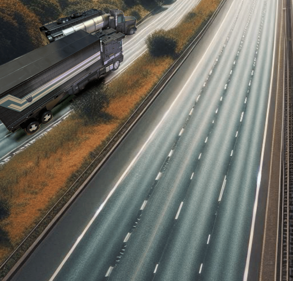 On the next motorway section, heading towards the zoo, the three vehicles inexplicably stopped firing upon the autobots, spinning 180 and sped ahead of Motormaster. Ahead of them the road was blocked again, not by the humans, but by the second truck that had joined with the oil tanker whom had both turned 90 degrees and parked on the motorway leaving a small gap between the two that the cars and Motormaster passed through.