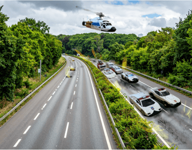 Unbeknownst to the director, the assistant and any of the cast and crew on the streets, the lead police car was able to send a communication to the Le Mans styled vehicle.