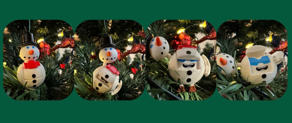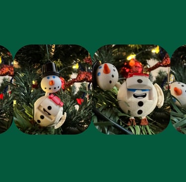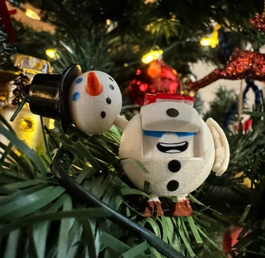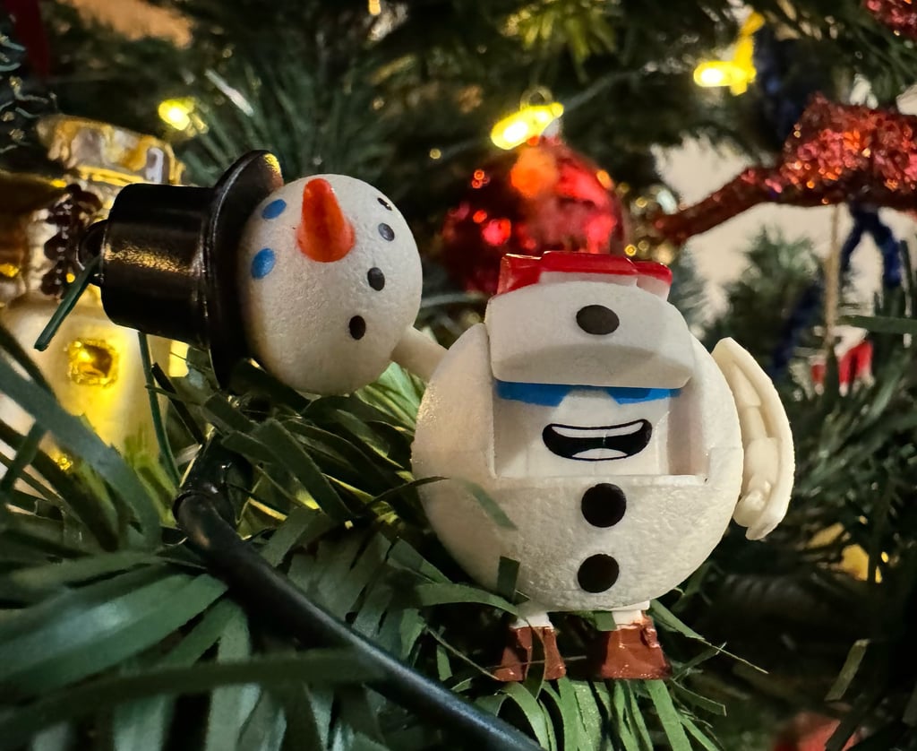 As it fell it started to shake, open and grow. The head of the snowman with its black top hat, rotated to the side of the main body. The front section with black buttons, slid up over the top revealing a happy smiling, yet robotic face. Little feet protruded from the base of the main body and a little arm appeared on its left side. It went from the 5cm it must have been as a Christmas bauble, to stand approx 1 metre in height next to the tree.
