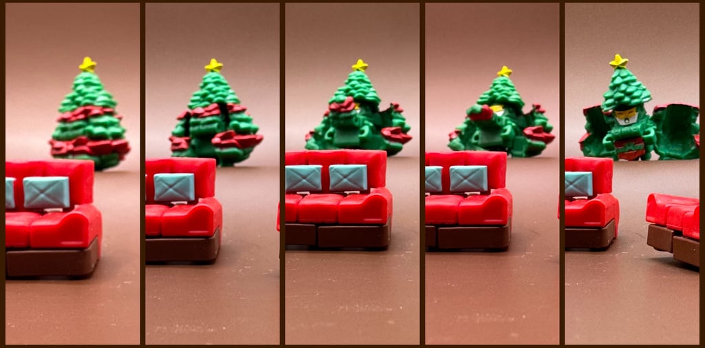 Back in the cabin, in the corner of the room, the Christmas tree shook, then its branches started to swing back and to the sides. Suddenly, and not visible before, the centre of the tree took on a robotic bipedal form. The branches gathered together around the back as if to form two wings. They started to flap and the green robot-Christmas tree flew outside the cabin, shining in the headlights of the truck like an angelic form.