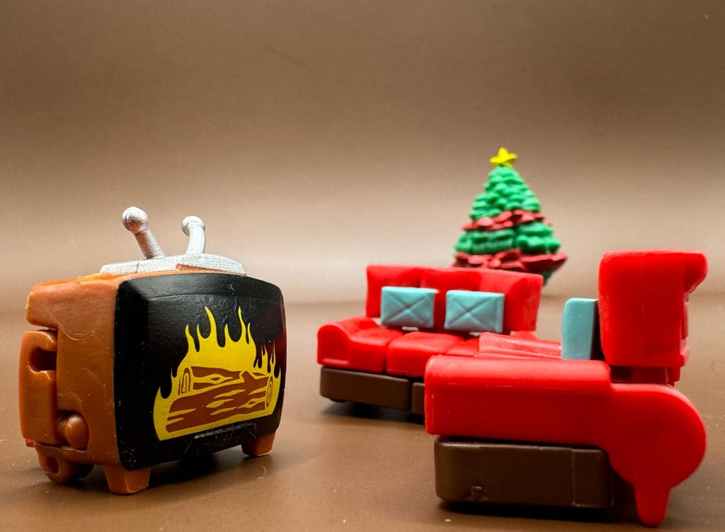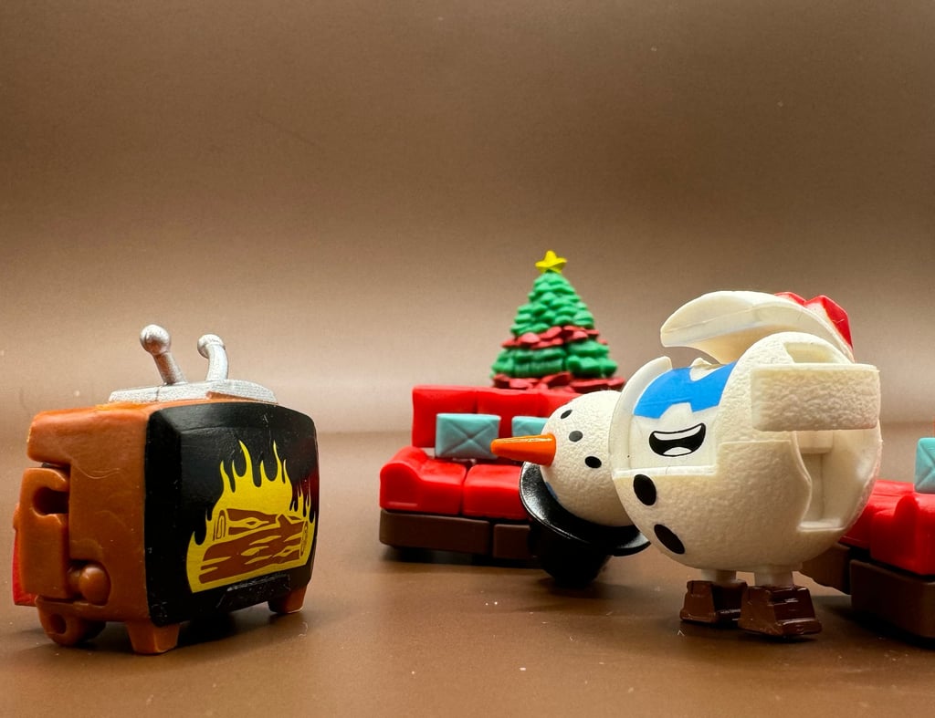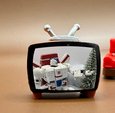The box continued, “Jazz was about to be attacked by a human with a hatred of us Transformers, but Jazz’s human companion Buster Whitwicky managed to convince the villain about something he called ‘the spirit of Christmas’ and the being gave Jazz what it called a ‘reprieve’. ” The images on the box’s screen changed from the log fire, to images of a white and black robot falling clumsily in the snow.