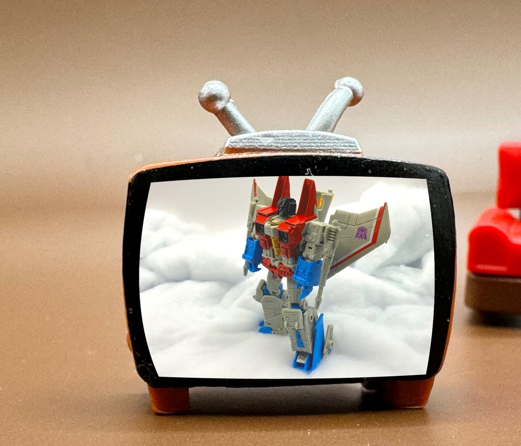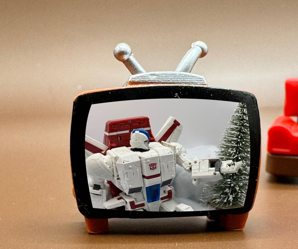 “Yes!” sighed the storyteller before continuing. “Jetfire was out in the winter snow and struggling to understand how he was a Transformer here on Earth. He hadn’t performed well in a fight when protecting his fellow Autobots, but did do well when he was protecting the humans. The human Buster, told him that was normal because Jetfire had been born a Transformer on Earth. Jetfire didn’t just learn about the Christmas spirit, but also the human spirit.” Again the images changed on the screen, to a white and red robot sat in snow looking at a Christmas Tree, then standing proudly by the house it was next too, before changing into a plane and flying away.