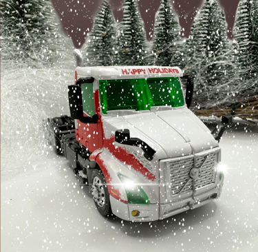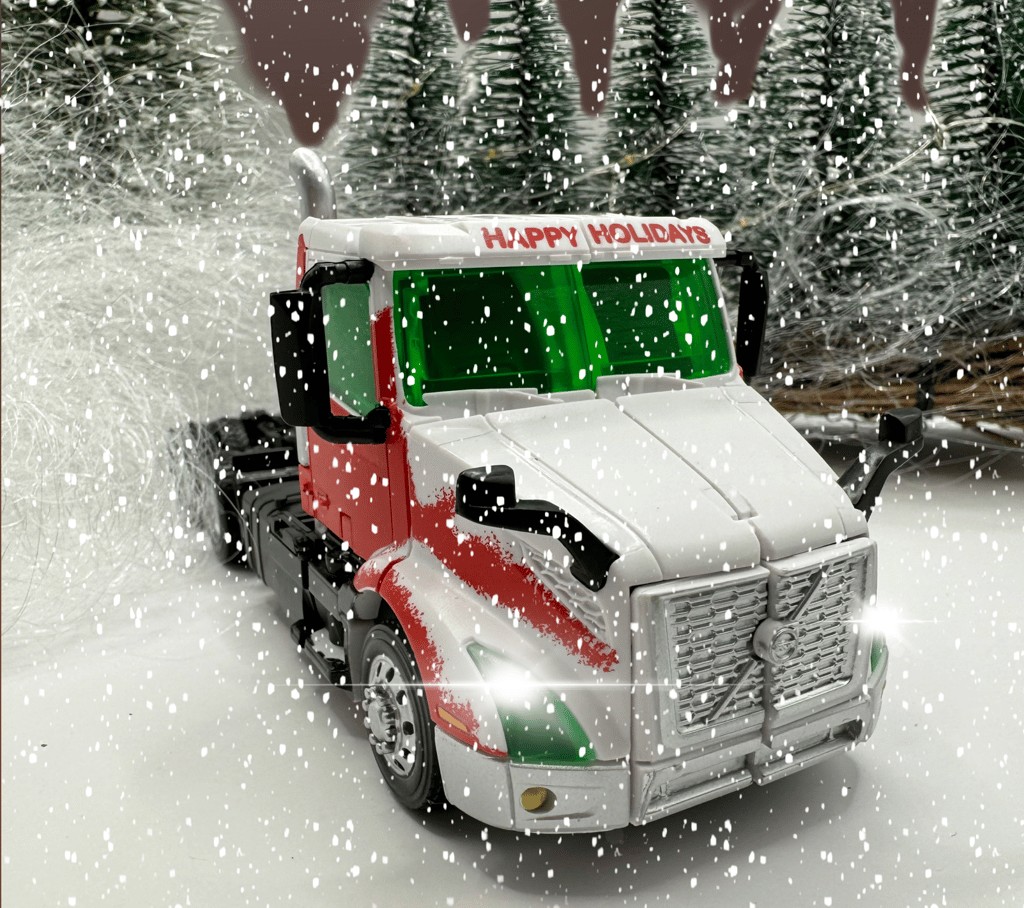 Optimus Prime looked around at the world surrounding him covered in snow. He arched his back slightly to stand proud and his eye sensors dimmed slightly as if he was pausing to take in the moment. Then he folded his arms into his chest, flipped his head up and over behind his neck and his feet up as his legs folded down to make his cab form again. From behind a snowflake the trailer appeared and combined with the cab. Prime moved his truck form out into the centre of the icy road and revved his engine such that smoke came from his exhaust stack. The snow had stopped falling and Prime shone his headlights along the icy pathway.
