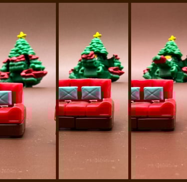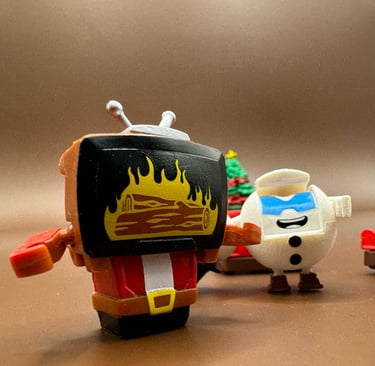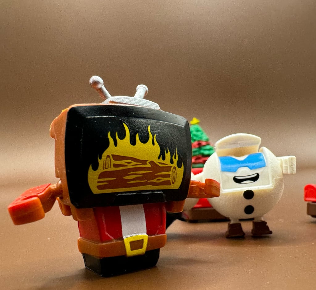 Its upper chest had two panels, seemingly cab windows, but green. Its upper torso was mainly red with hints of white at the end of its arms. Its upper legs red but its lower legs and feet black with hints of white. Yule, being an expert on the human’s Christmas festive event, recognised the robot immediately.