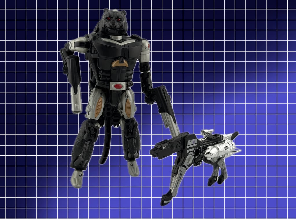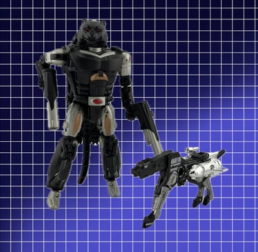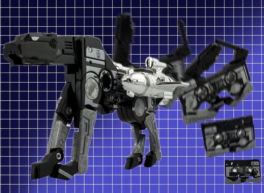 Although since 1984 there have been numerous bipedal Transformers that are able to change into a quadrupedal form, either robotic or the evolved Transformers with “beast forms” as their alternative modes (“alt modes”), Ravage’s original alt mode was a 1980s cassette tape. The fictional explanation of how a giant robotic dog can change into a 10cm tape is via a process called “mass displacement” without an explicable scientific basis (probably the ability for mass to temporarily change to energy for a reduced form). Over the years, alternative versions of Ravage have had different forms, but a notable version is an evolved beast version that changed from a panther to a bipedal robot.