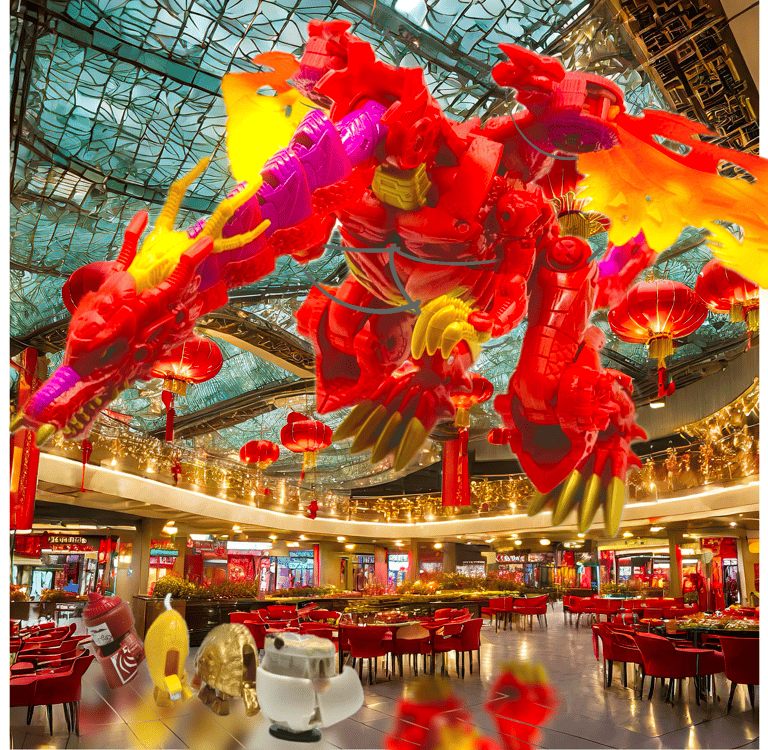 “COME!” said CrimsonFlame, shaking the mini-bots from their hypnotic watching of Megatron disappear. “TO THE MALL. TRANSFORM, I SHALL CARRY YOU”. And with that, CrimsonFlame folded his form inwards such that a dragon’s head, arms and legs once again appeared. In the claws of one of his arms, he collected a fortune cookie, a bottle of soy sauce, a golden steam dumpling and a bowl of noodles (half empty). With a sleekness of form, with his dragon body pointed like an arrow, he headed directly back up the Nanjing Road back to the shopping mall.